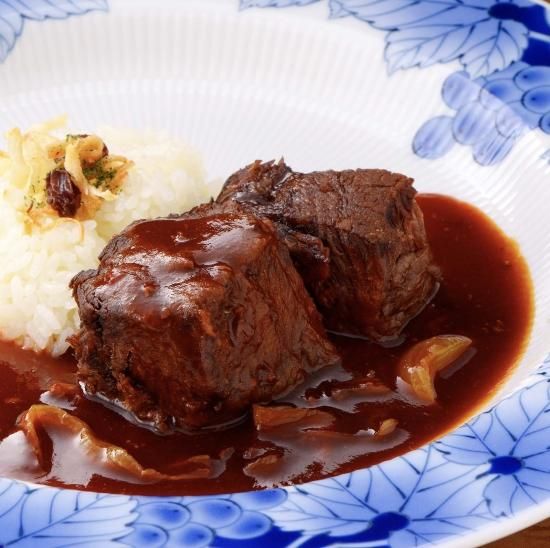 赤ワインと香味野菜でとろけるまでじっくり煮込み、旨味を最大限に引き出した佐賀牛を、自家製デミグラスソースと合わせた珠玉の一皿です。